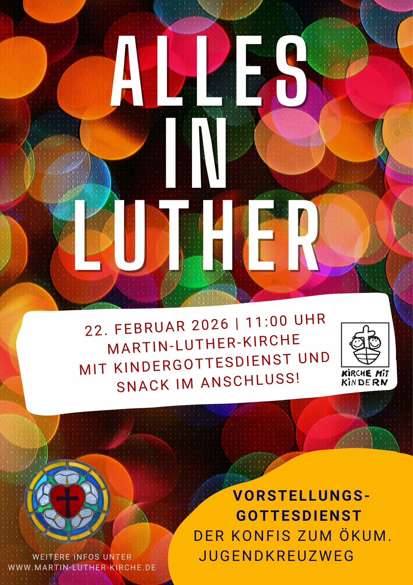 In unserer Sonder-Gottesdienstreihe "Alles in Luther" feiern wir am 22. Februar um 11 Uhr in der Martin-Luther-Winterkirche den Vorstellungsgottesdienst der Konfis. Die jungen Leute werden Elemente vom ökumenischen Jugendkreuzweg vorstellen.