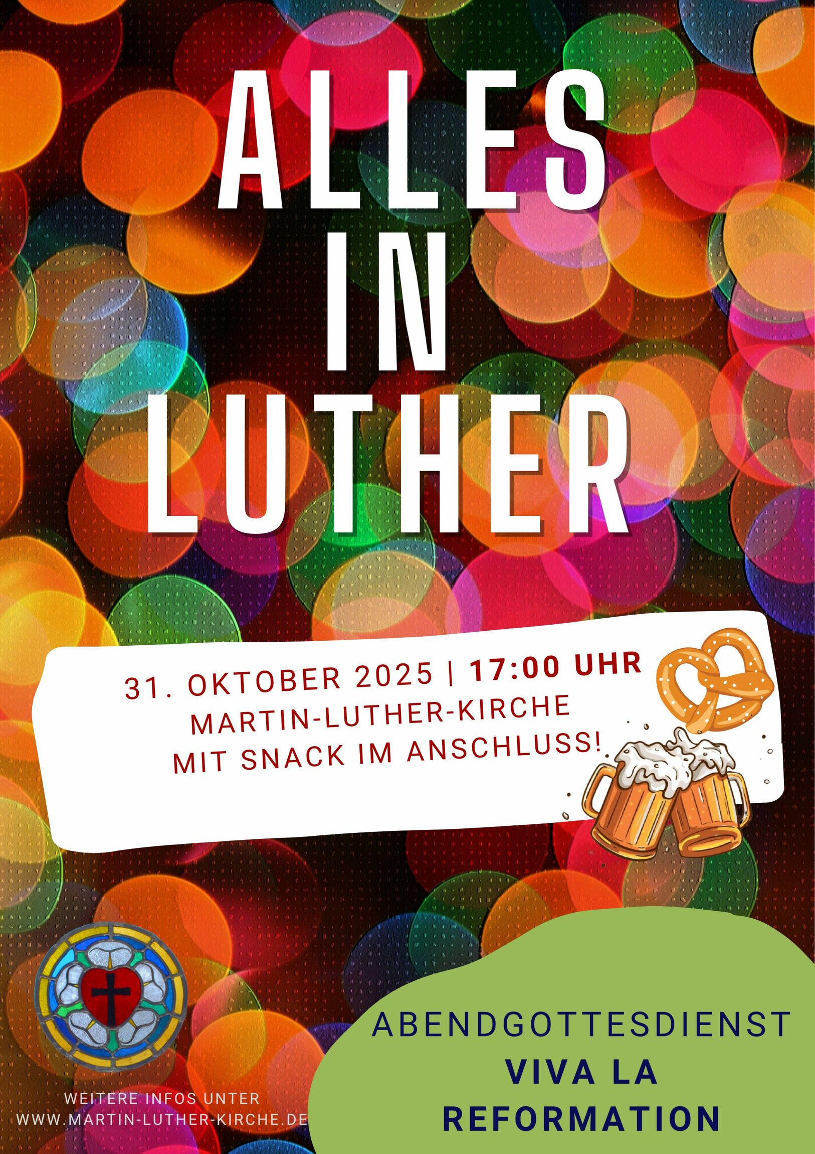 "Viva la Reformation" heißt es am 31. Oktober um 17 Uhr in der Martin-Luther-Kirche. Wir feiern den Reformationstag mit einem kurzweiligen Gottesdienst - mit kleiner Band, Kindern, Filmclip und Interaktion. Hinterher gibt es Bier & Brezeln. Herzlich Willkommen!